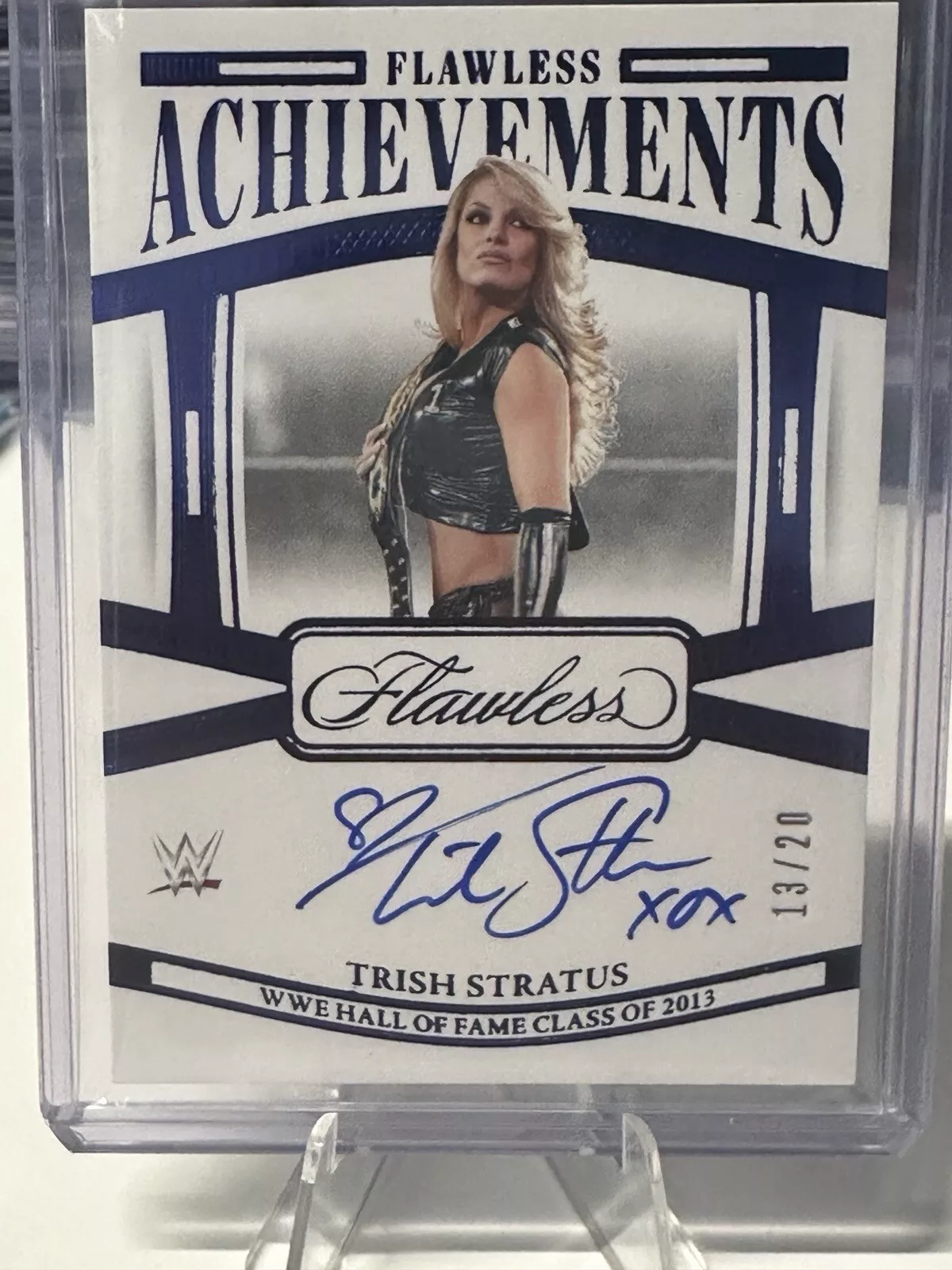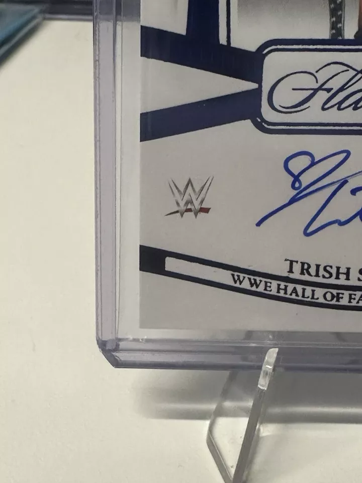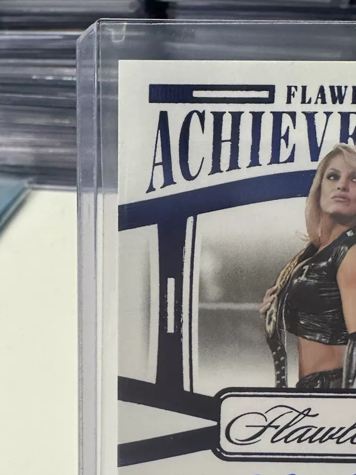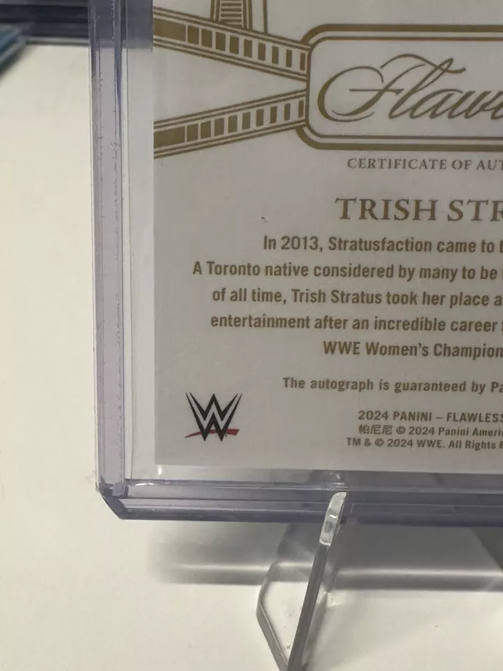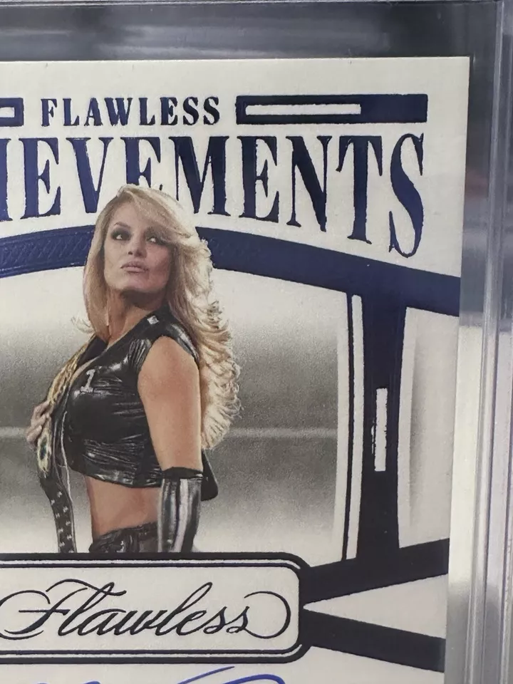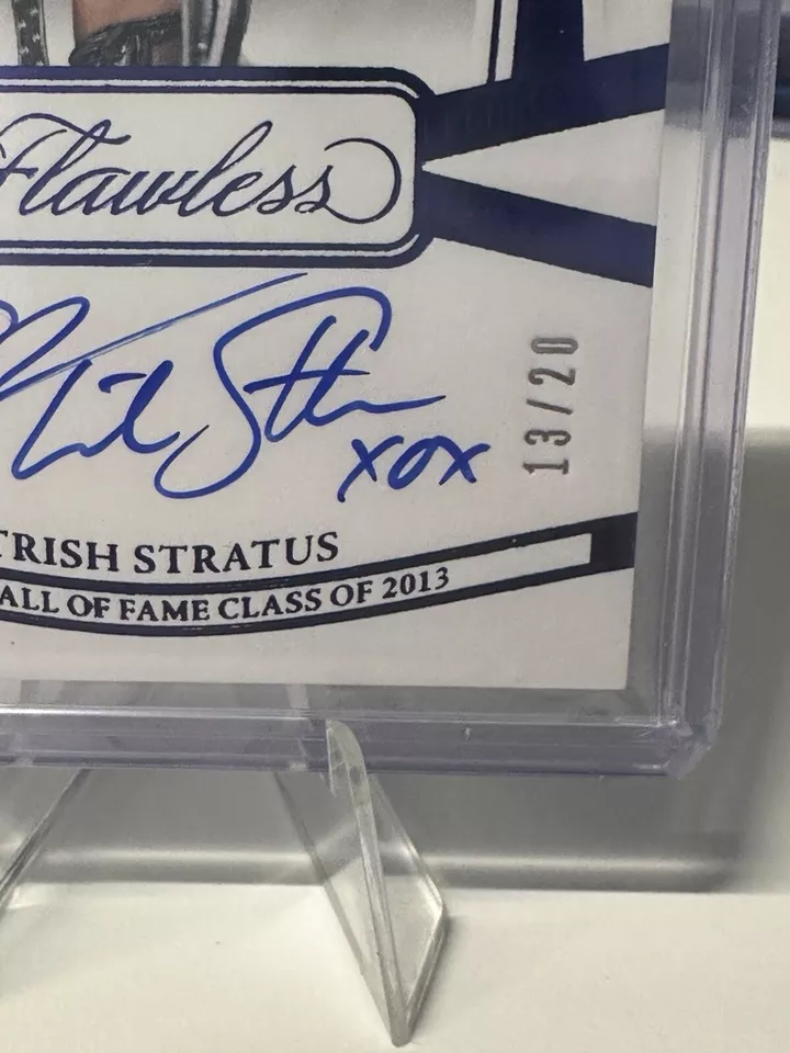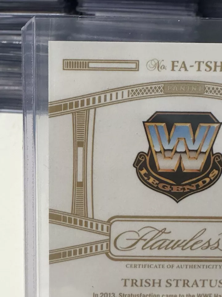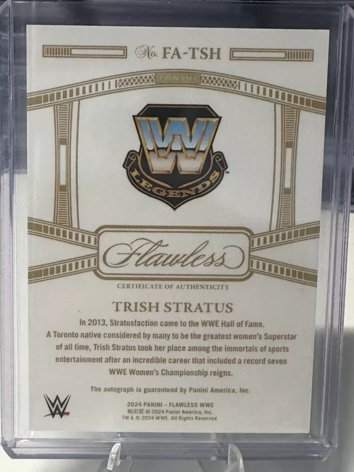 The 2024 Panini Flawless WWE trading card features WWE wrestler Trish Stratus and is part of the “Flawless Achievements” insert set. This particular card is a Sapphire parallel variety with a limited print run of only 20 copies, and it is serial numbered as card number FA-TSH. Manufactured by Panini, this sports trading card is highly sought after by collectors due to its rarity and exclusive features.