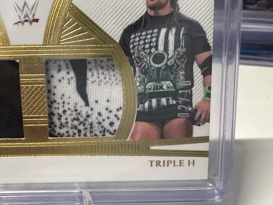 Availability: In Stock The 2024 Panini Flawless WWE Shawn Michaels Triple H Dual Patch #FD-STH Gold DX 2/10 is a rare sports trading card featuring two iconic WWE wrestlers, Shawn Michaels and Triple H. This card is part of a limited print run of 10, making it highly collectible for wrestling fans. The card showcases dual patches from both wrestlers, adding to its unique appeal. The gold DX parallel variety further enhances the card’s exclusivity, with serial numbering adding to its authenticity. This trading card is a must-have for fans of WWE and collectors of sports memorabilia.