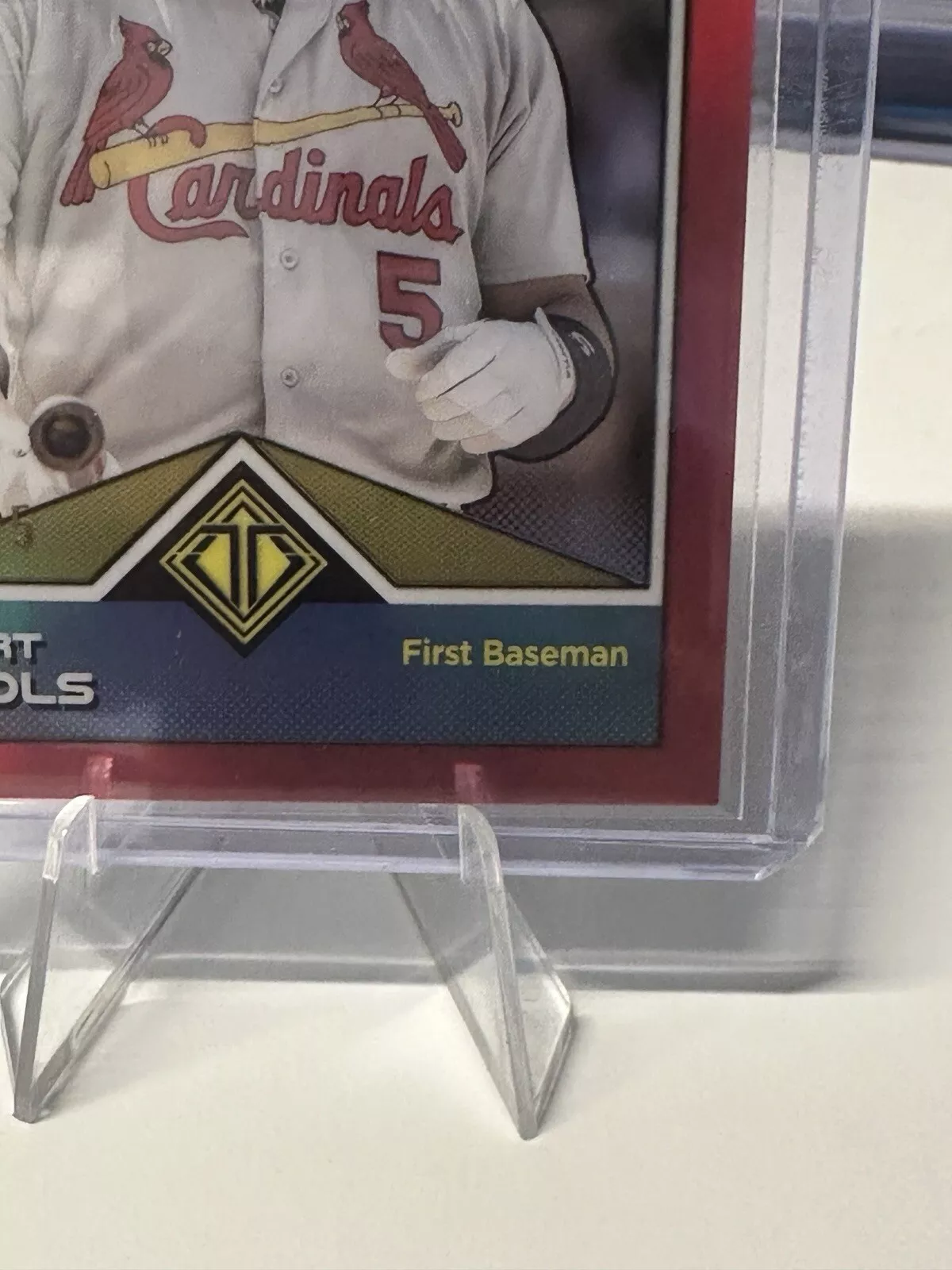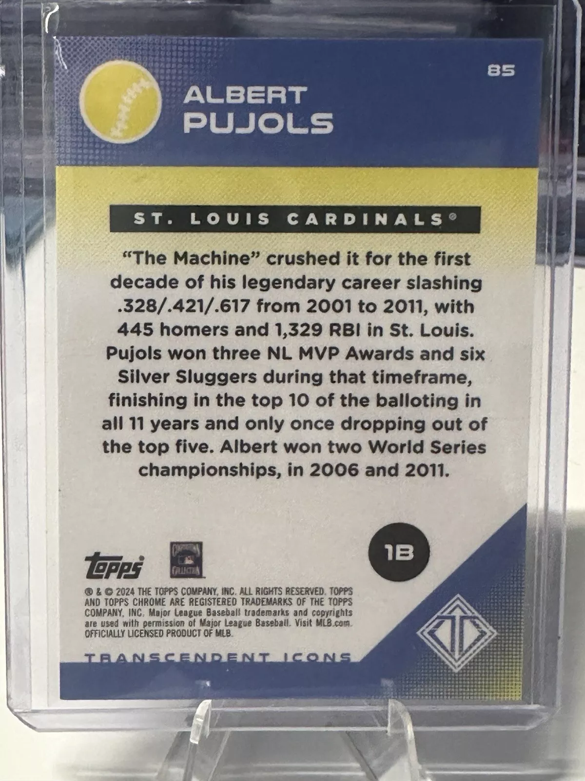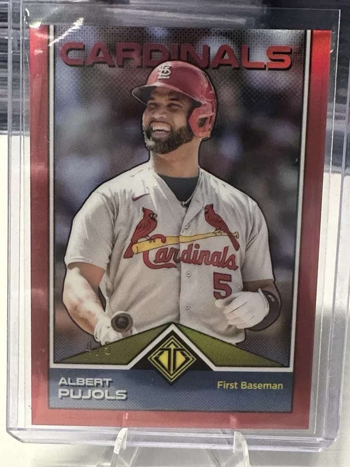 The product is a 2024 Topps Transcendent baseball trading card featuring Albert Pujols of the St. Louis Cardinals. This particular card is a Red Refractor parallel variety with a low print run of only 5 copies, making it highly collectible. It is serial numbered as 4/5, indicating that this specific card is the 4th out of the 5 produced. This rare and unique card is sure to be a prized possession for any baseball card collector or fan of Albert Pujols.