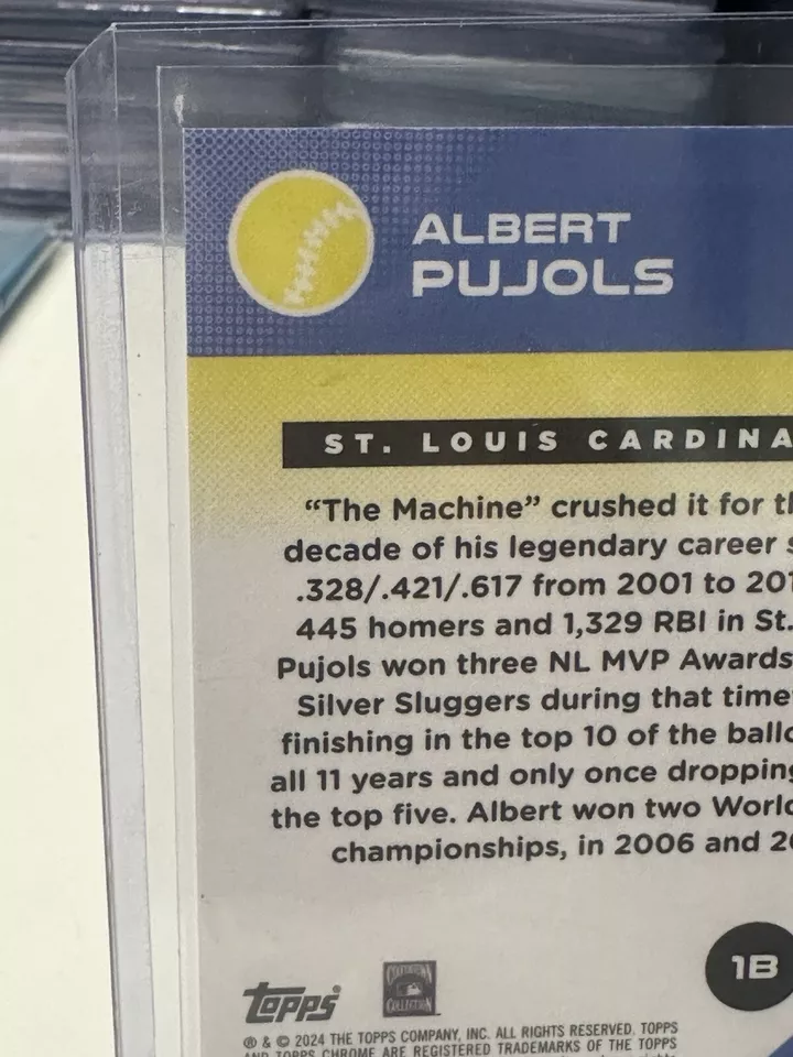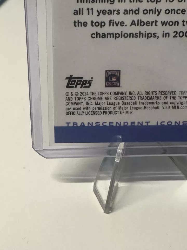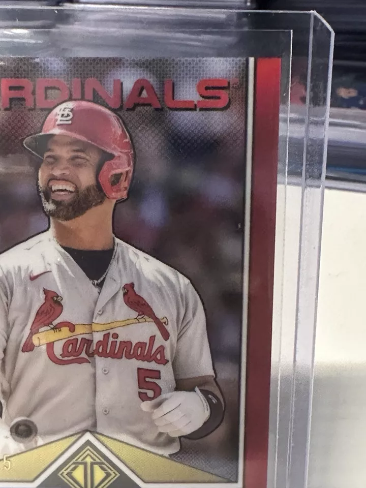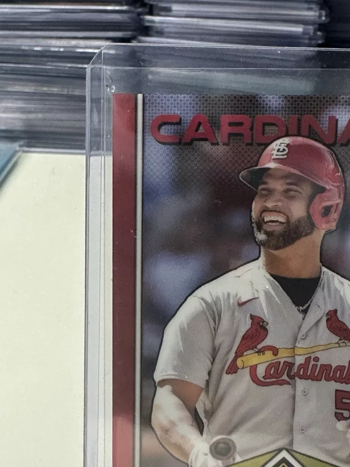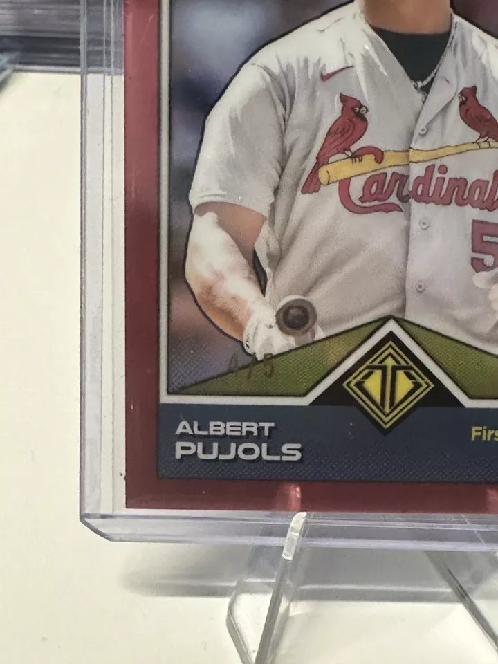 The product is a 2024 Topps Transcendent baseball trading card featuring Albert Pujols of the St. Louis Cardinals. This particular card is a Red Refractor parallel variety with a low print run of only 5 copies, making it highly collectible. It is serial numbered as 4/5, indicating that this specific card is the 4th out of the 5 produced. This rare and unique card is sure to be a prized possession for any baseball card collector or fan of Albert Pujols.
