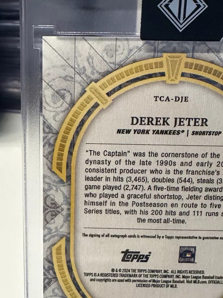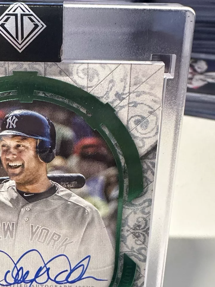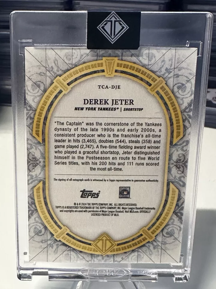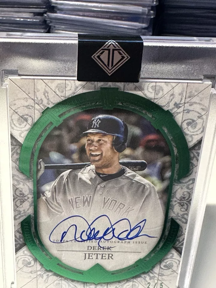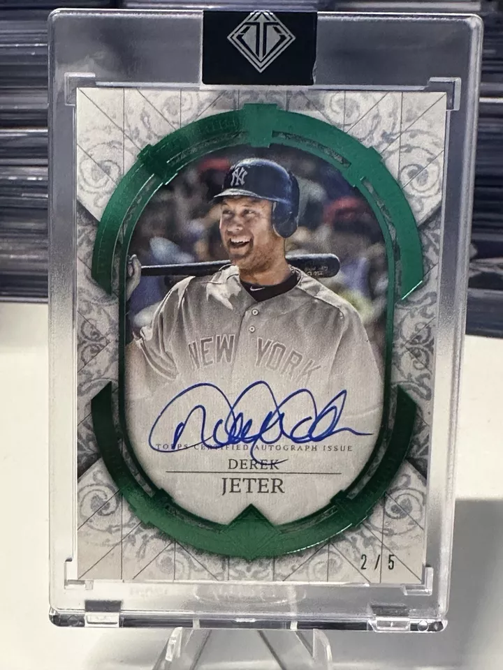 The 2024 Topps Transcendent Derek Jeter Emerald Auto 2/5 Jersey Number trading card is a highly collectible item featuring an autograph from the legendary baseball player Derek Jeter. This limited edition card is autographed by Jeter himself and is part of a set with a print run of only 5 cards. The card is authenticated by Topps and includes a unique serial number, making it a rare and valuable piece for any New York Yankees or baseball memorabilia collector.