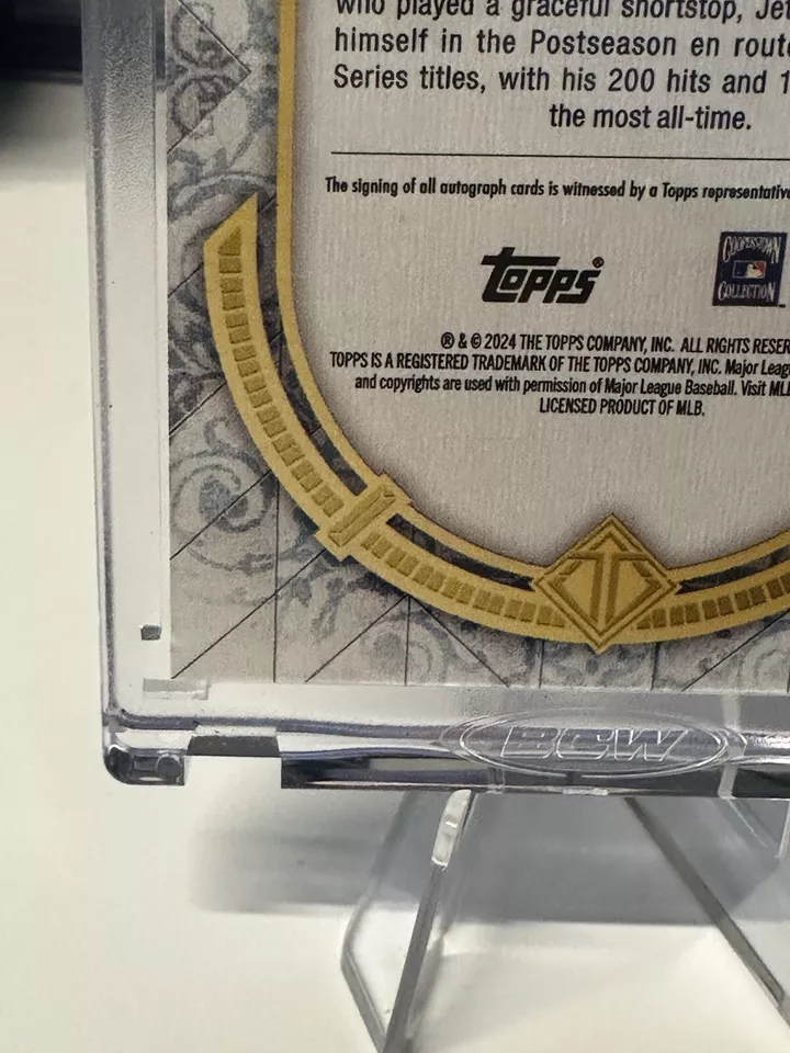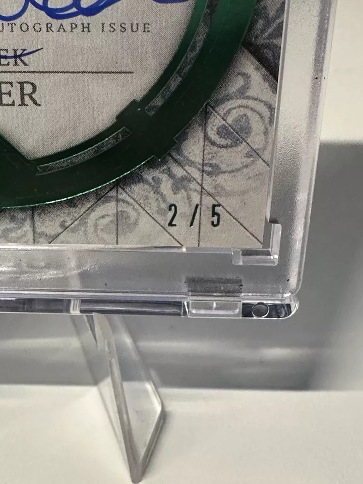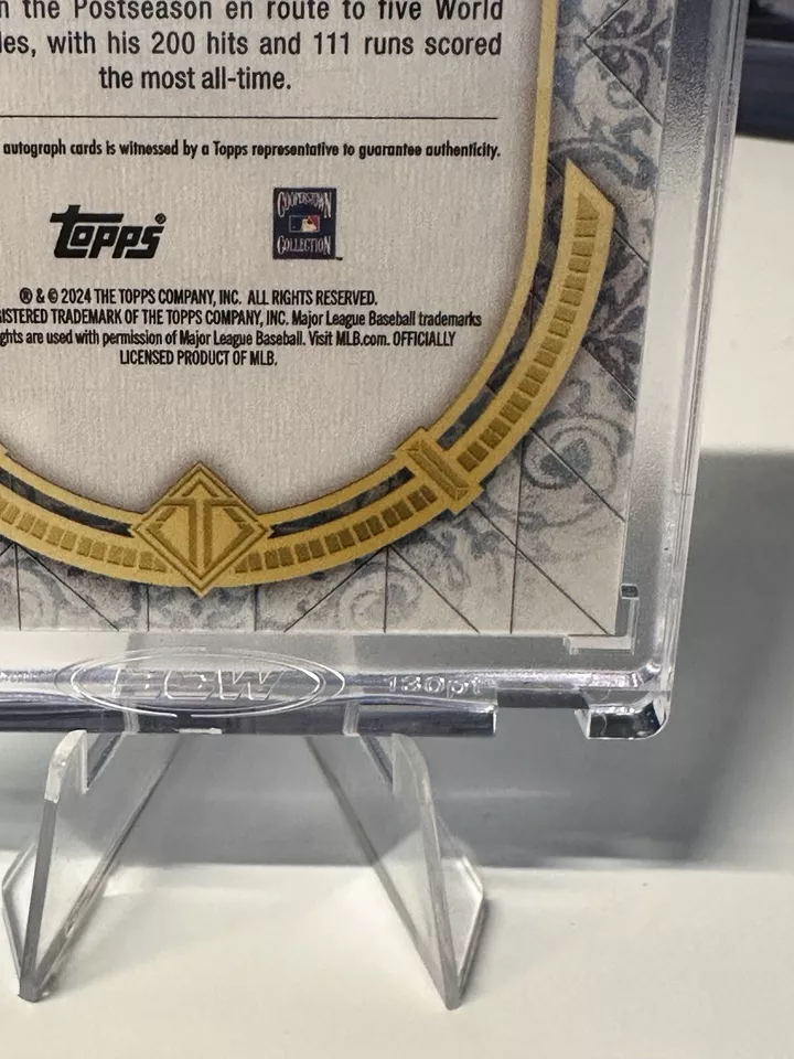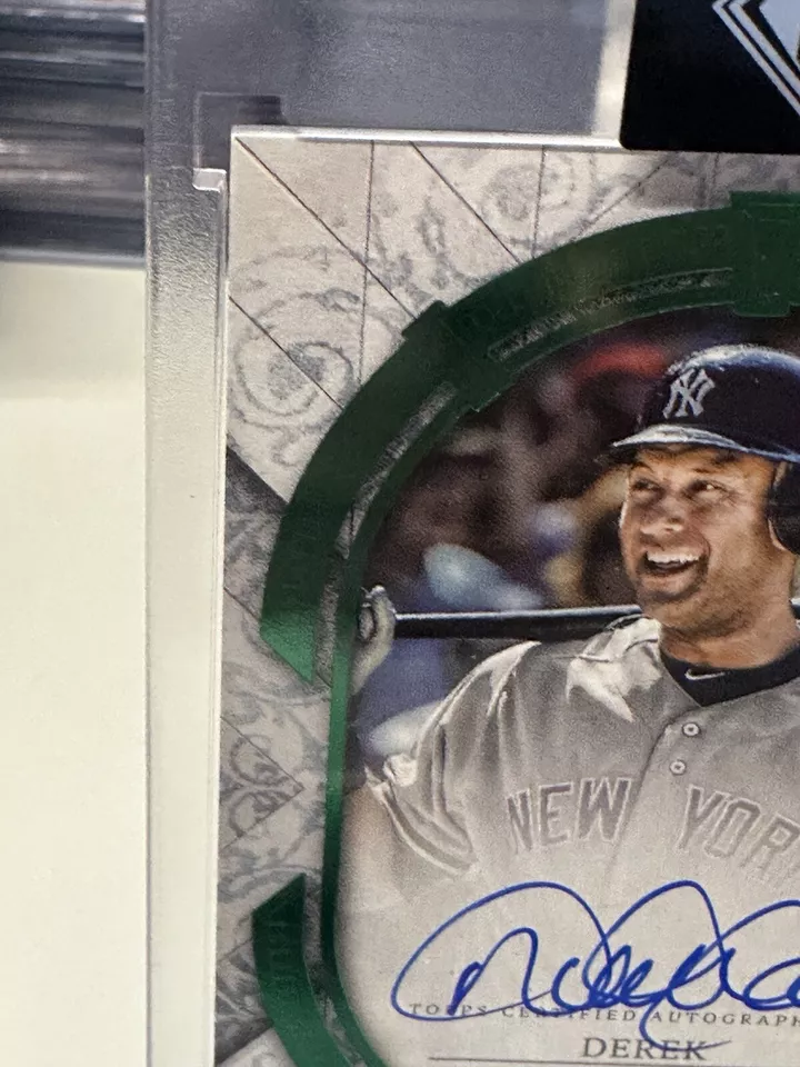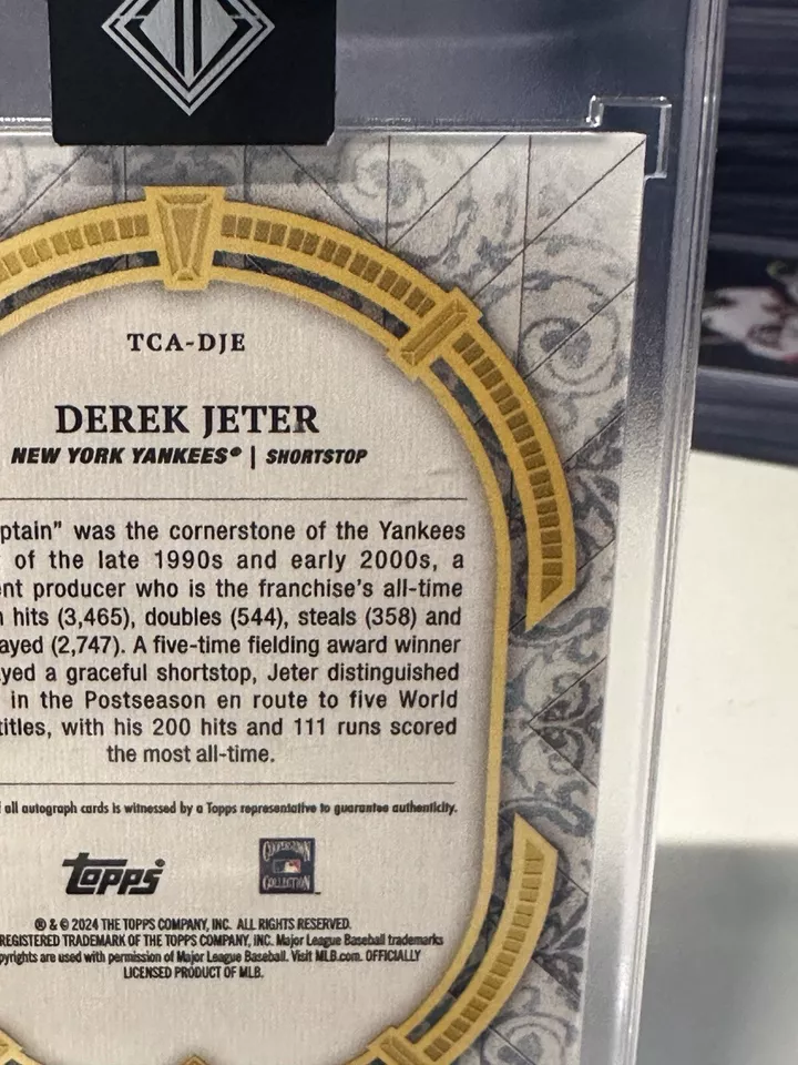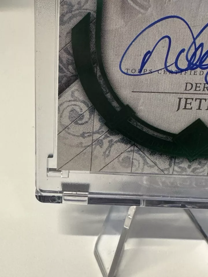 The 2024 Topps Transcendent Derek Jeter Emerald Auto 2/5 Jersey Number trading card is a highly collectible item featuring an autograph from the legendary baseball player Derek Jeter. This limited edition card is autographed by Jeter himself and is part of a set with a print run of only 5 cards. The card is authenticated by Topps and includes a unique serial number, making it a rare and valuable piece for any New York Yankees or baseball memorabilia collector.